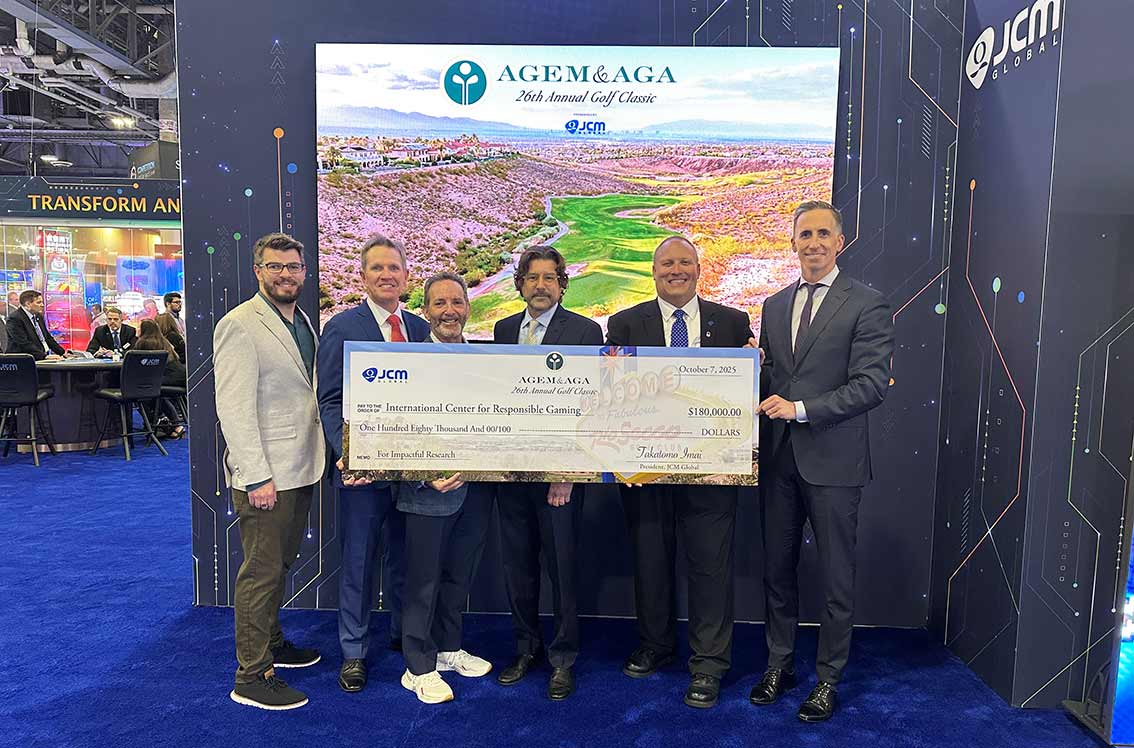 LAS VEGAS, NV – During the annual Global Gaming Expo (G2E), AGEM, the AGA, and JCM Global presented a check for $180,000 for the International Center for Responsible Gaming (ICRG). The money was raised at the 26th annual AGEM & AGA Golf Classic Presented by JCM Global, which was held in May.