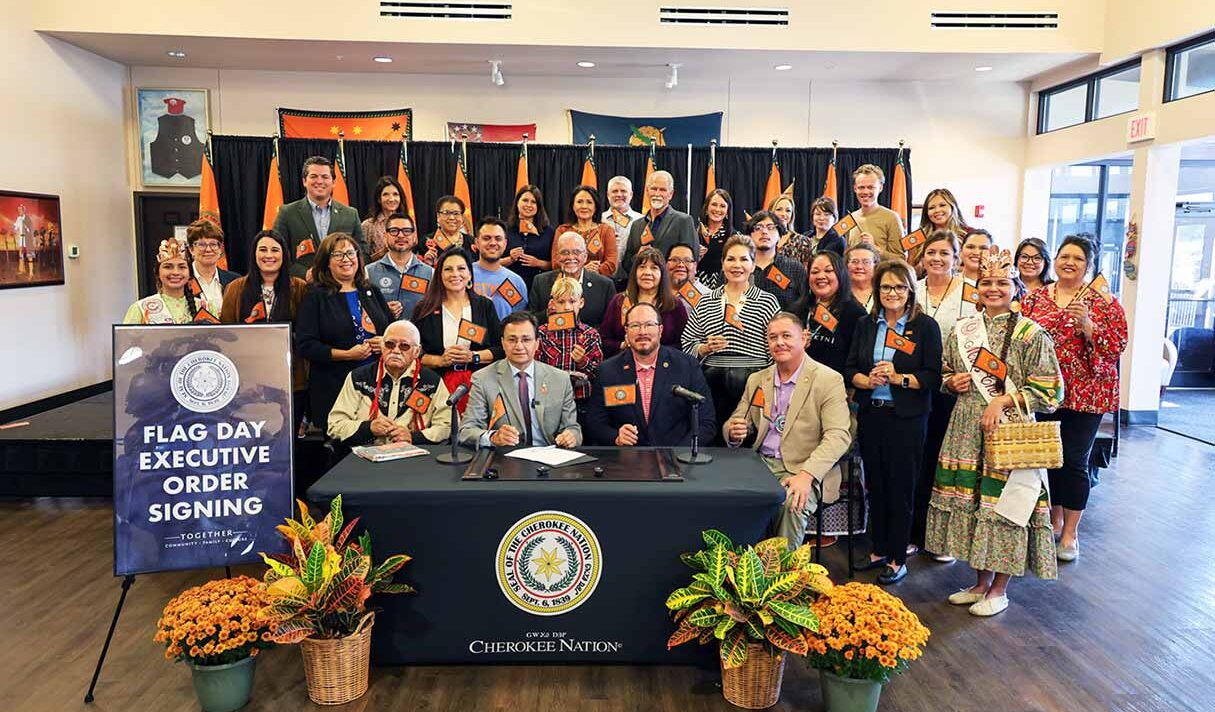 TAHLEQUAH, OK – Cherokee Nation Principal Chief Chuck Hoskin Jr. and Deputy Chief Bryan Warner signed an executive order Wednesday, officially establishing Cherokee Nation Flag Day to be celebrated annually on October 8. The executive order designates the day as a time to honor the Cherokee Nation flag, reaffirm sovereignty, and educate future generations about the symbols and history of the Cherokee people.
