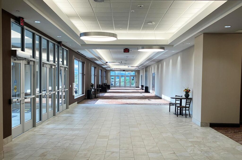 The modern design of the expanded convention center includes high-volume ceilings, audio and visual accommodations, a high-capacity kitchen and multiple event bars. Outdoor courtyards complement the existing architecture, providing space for an array of events, including weddings, banquets, business conventions and special events. The new grand ballroom will have the capacity to accommodate an additional 750 guests seated and up to 1,200 guests for larger expos and events, adding a much-needed large event space to the area.