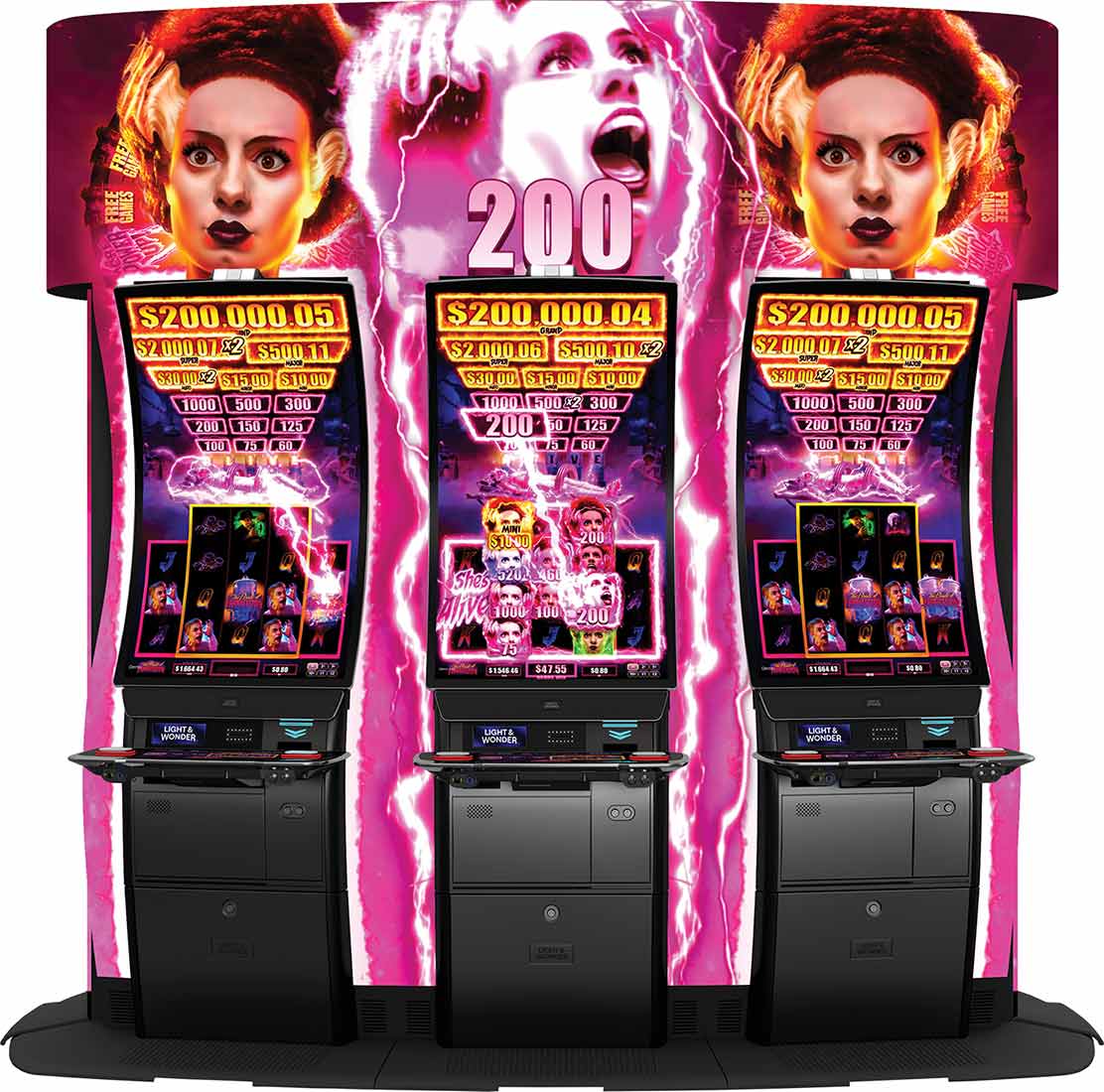 She’ll vow to shock you…introducing Bride of Frankenstein™ to the Monsters™ series. The Bride of Frankenstein will expand the monster-verse with even more energy and surreal, electrifying action on the inventive Lightwave™ cabinet, with content sprawling across a canvas of up to 170 inches. Bride of Frankenstein introduces the She’s Alive feature. Land a She’s Alive on reels one and five and any Wild on reels two through four to trigger the feature and watch as each Normal Monster awards a prize from the prize board. Each Green Monster increments the multiplier on the awarded prize up to five times. Every scatter that lands sends a lightning bolt to the Bride of Frankenstein pot. Spelling out “Alive” triggers free games. During free games, two scattered Wheel symbols trigger the Wheel feature. The Wheel feature packs a thrilling punch with a great array of prizes, enhancements, and features. Do you think you have what it takes to approach the Bride of Frankenstein?