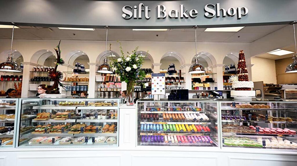 Sift Bake Shop is a 2,930 sq. ft. bakery that features a variety of artisanal breads, breakfast pastries, and sweet and savory delights. All menu items start from scratch with fresh ingredients, and every menu item from Sift Bake Shop is made in-house in a state-of-the-art kitchen. Signature desserts at Sift Bake Shop include the chocolate croissant, the Opera Cake, the pecan sticky bun, and the carrot cake roulade. Guests can also enjoy select gluten-free cookies. Guests can pair their treats with an assortment of coffees, teas, lattes, and artisanal beverages.