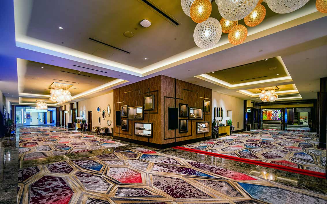 Interior designers on the Pechanga Grand Ballroom transformation, Klai Juba Wald of Las Vegas, sought cohesion with Pechanga’s adjacent Summit Events Center, completed in 2018 as part of the resort casino’s $385 million expansion. Designers incorporated bold geometric patterns and vibrant colors with warm neutral tones and finishes. The goal was to honor the original design and create a synchronous blend of tradition with modern elegance.