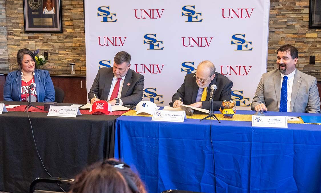 DURANT, OK – Southeastern Oklahoma State University and the Tribal Education Initiative at the University of Nevada, Las Vegas (UNLV)’s William F. Harrah College of Hospitality announced a partnership to educate and prepare students for careers in tribal gaming and hospitality enterprises in a ceremony on the Southeastern campus.